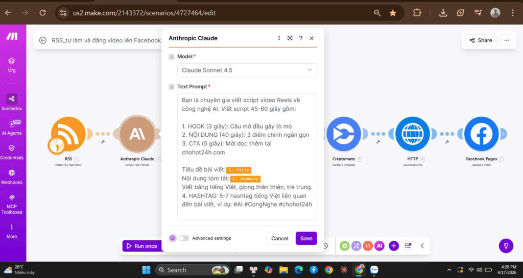 Claude Sonnet (AI của Anthropic) đọc tiêu đề và tóm tắt bài viết, sau đó tự động viết kịch bản video 45-60 giây gồm: Hook gây tò mò (3 giây đầu), 3 điểm nội dung chính (40 giây), CTA kêu gọi đọc thêm và hashtag tiếng Việt liên quan.