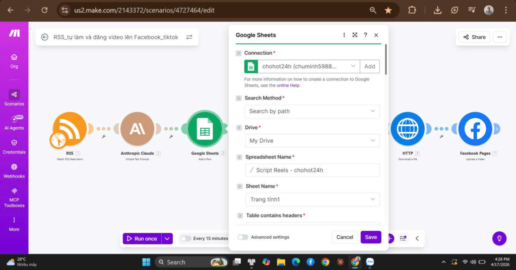 Bước 3 — Google Sheets Lưu Kịch Bản