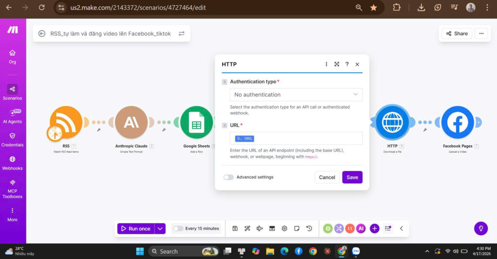 Hệ thống tự động tải file video từ Creatomate về để chuẩn bị đăng lên Facebook.
